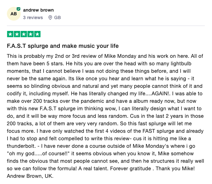 The FAST Splurge makes your practice way more potent...you improve as a music producer at a startling rate...and it consistently delivers clarity on your highest impact next steps.